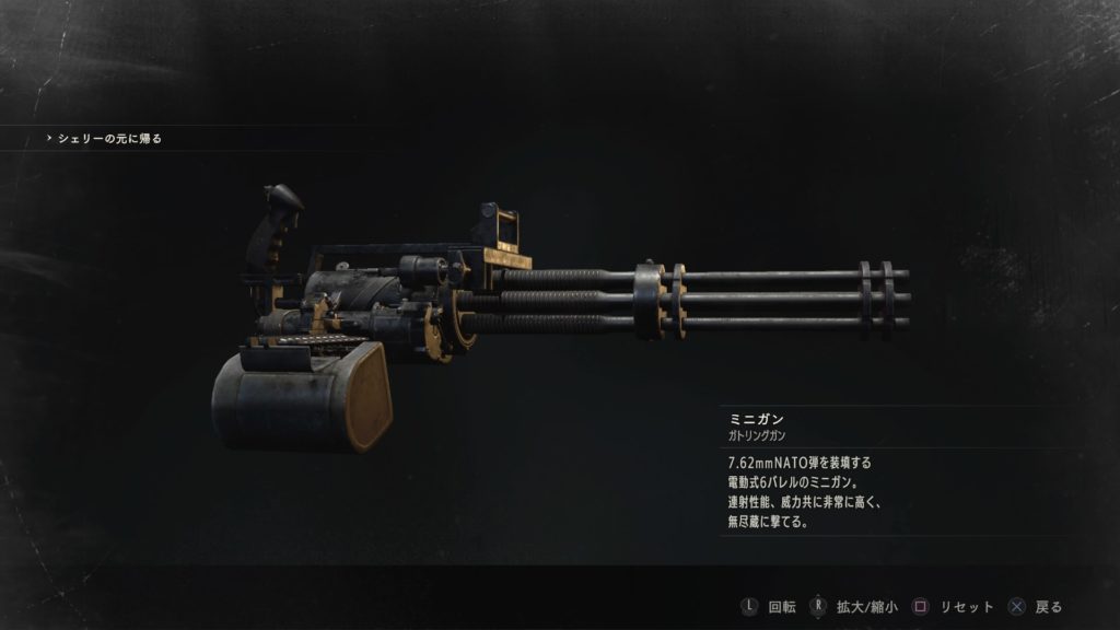 クレア編のストーリー終盤で手に入るミニガンと同じ性能を持っており、リロードの概念はない。